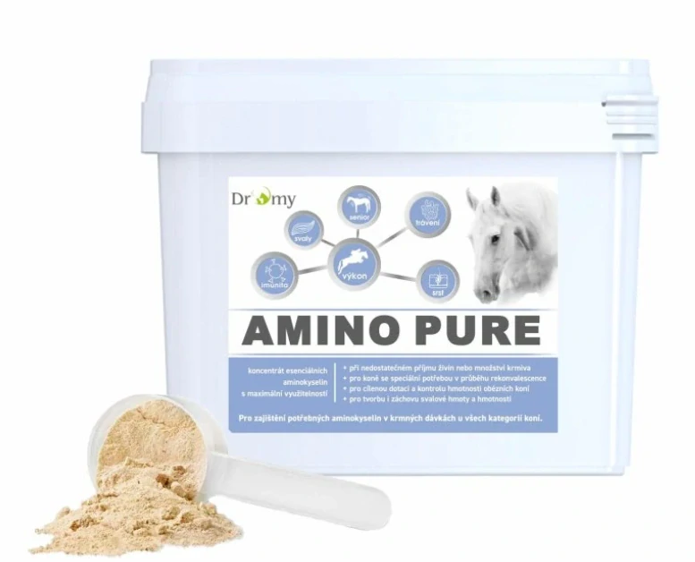 Amino PURE je sypký doplněk stravy, který obsahuje optimalizovaný mix sedmi klíčových esenciálních aminokyselin v koncentrované formě spolu s peptidy s rozvětveným řetězcem. Tyto látky kůň dokáže plně vstřebat již v tenkém střevě. Produkt lze podávat společně s jakýmkoli krmivem, včetně mineralizovaných krmiv a olejnatých složek, a to krátkodobě i dlouhodobě. Díky vyváženému složení poskytuje efektivní podporu výživy koně i v náročných situacích, s maximální využitelností nezbytných esenciálních aminokyselin.
