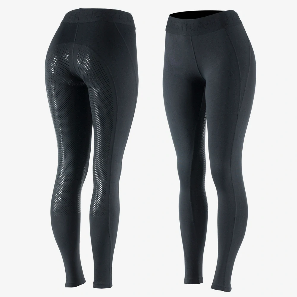 Legíny Horze mají celogripový sed. V pase široká guma s logem Horze Equestrian.