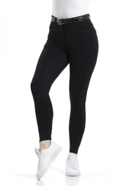 Dámské jezdecké rajtky jsou vyrobeny z příjemného prodyšného materiálu. Mají celogripový sed ve tvaru drobných trojúhelníčků. Nohavice jsou ukončeny elastickou vsadkou. Na levé nohavici dole je kontrastní bílý nápis Equitheme.