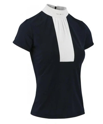 Dámské závodní triko v modré barvě je vyrobené z příjemného prodyšného materiálu. Je lehce vypasované. U krku je stojáček zdobená lesklými kamínky. Pod stojáčkem je materiál lehce nařasený. Na levém rukávu je stříbrné logo Equitheme. Triko má zapínání vzadu uprostřed na zip.