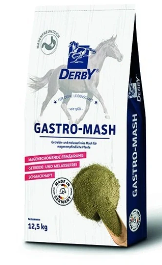 DERBY® Gastro-Mash je bezobilná kaše pro koně s citlivým žaludkem. Sliz ve lněném semínku chrání střevní sliznici, zvyšuje kluznost rmutu a snižuje riziko zácpy. Gastrokomplex DERBY, který obsahuje, se skládá z kombinace přírodních huminových a fulvových kyselin. Mohou mít detoxikační účinek a absorbovat přebytečnou žaludeční kyselinu. Proto jsou ideální jako přírodní blokátor kyselin. Kromě toho mohou chránit sliznici střevního traktu před lézemi souvisejícími s kyselinami. Dalším plusem je praktické použití: Jako okamžitě rozpustnou kaši stačí zalít vlažnou vodou, zamíchat a podávat.