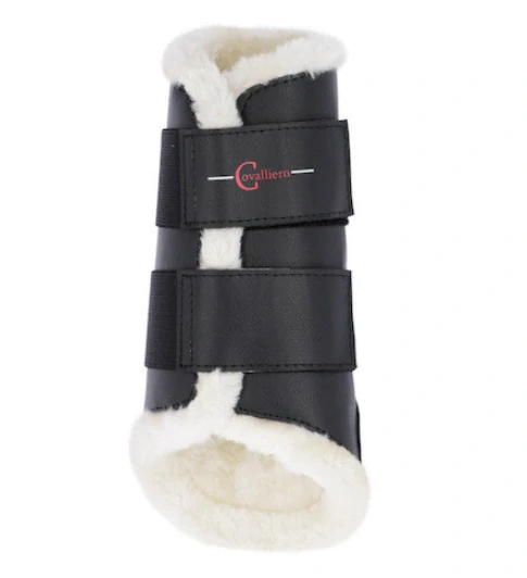 Drezurní chrániče na přední nohy ze syntetické kůže - ideální ochrana pro ochranu šlach koně se zvýšeným komfortem díky umělému beránku uvnitř. Jednoduché zapínání pomocí širokých suchých zipů na elastickám pásku.