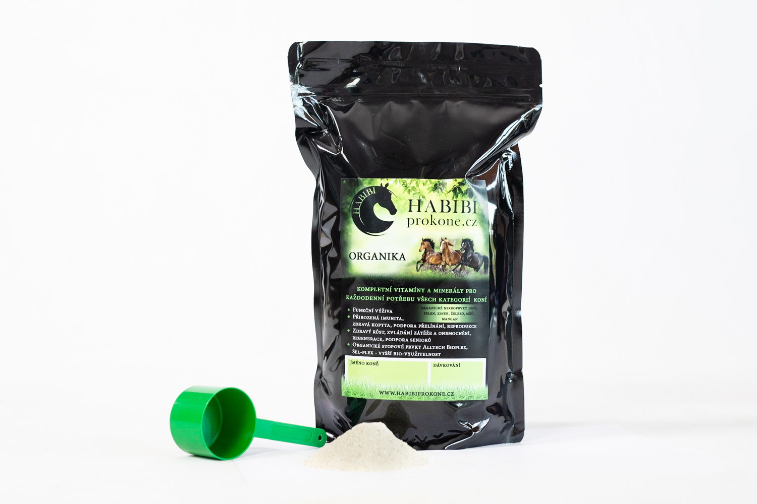 Charakteristika: Vitamíny a minerály pro kažododenní podávání. Stopové prvky 100% hrazené organickými formami. Vyvážené poměry vitamínu a minerálu přispívají k dobrému zdravotnímu stavu, zdravému vývoji rostoucích koní a zvládání záteže. Jsou duležité i pro zdravou kůži, srst i kvalitní kopytní rohovinu. Potřeba těchto živin stoupá zejména v období vyšší zátěže, březosti, kojení a růstu, onemocnění a přelínání. Podávejte každodenně jako součást krmné dávky. K Habibi Organice je možné podávat další směsi Habibi dle individuální potřeby Vašeho koně.