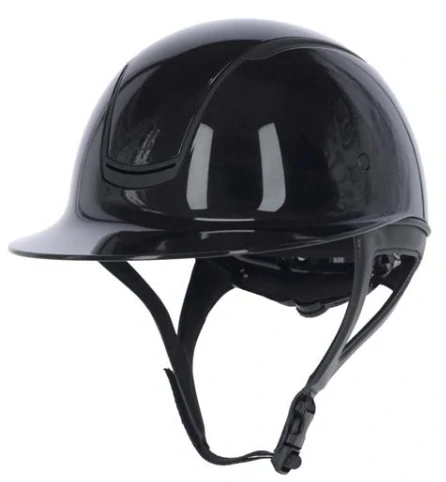 Jezdecká helma na koně v černé barvě s lesklou skořepinou a širokým polo kšiltem.