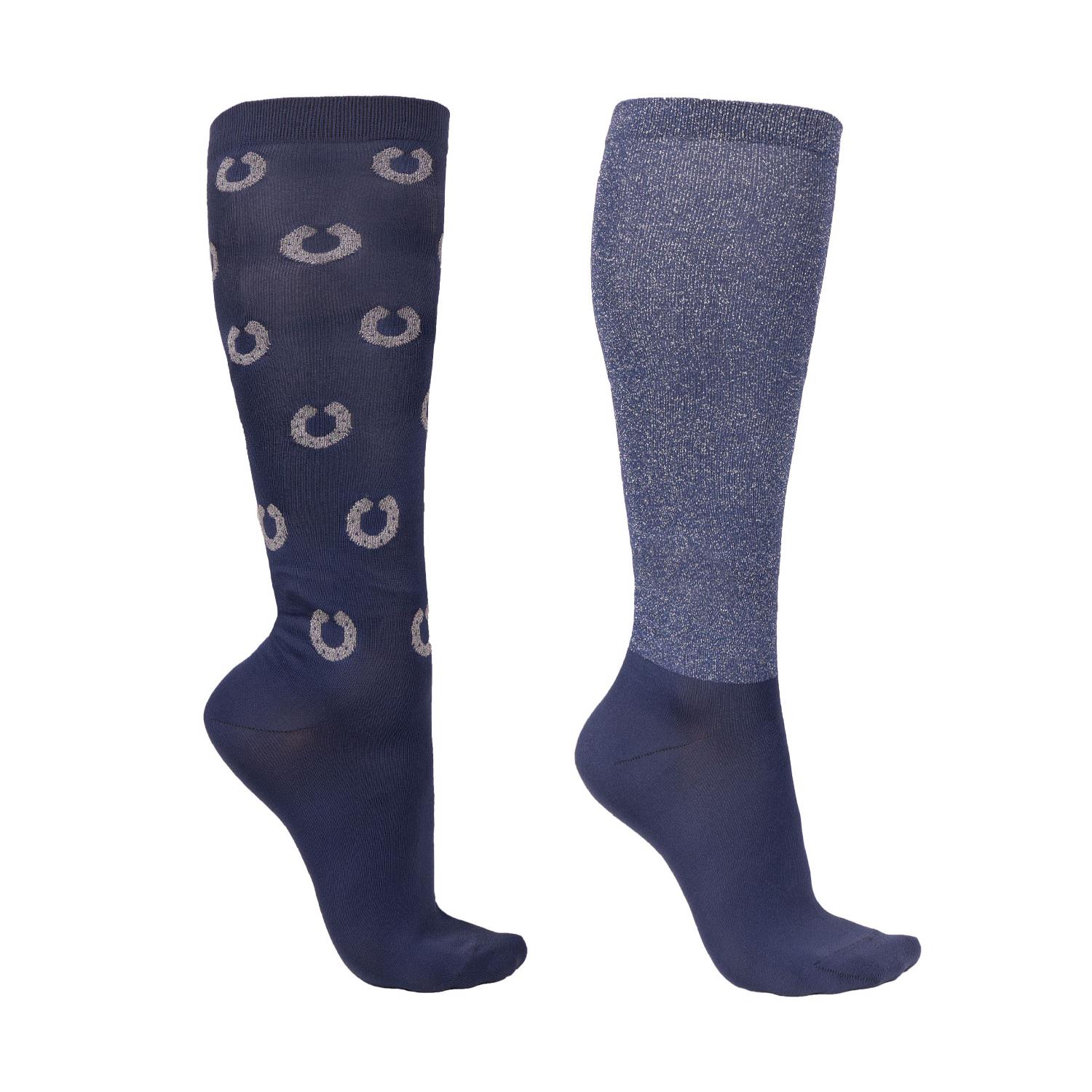 Sada dvou párů jezdeckých podkolenek v dárkové krabičce s nápisem Congratulations. Ponožky jsou vyrobeny z příjemného, pružného materiálu. Jeden pár je tmavě modrý se vzorem podkoviček, druhý je třpytivě modrý.