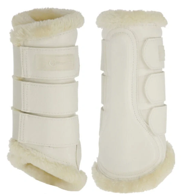 Chrániče na přední nohy s anatomickým střihem, z odolné syntetické kůže, zapínáním na suchý zip a měkkým umělým beránkem uvnitř. Chrániče lze použít ve větších velikostech použít i na zadní nohy.