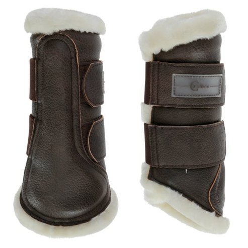 Chrániče na přední nohy s anatomickým střihem, z odolné syntetické kůže, zapínáním na suchý zip a měkkým umělým beránkem uvnitř. Chrániče lze použít ve větších velikostech použít i na zadní nohy.