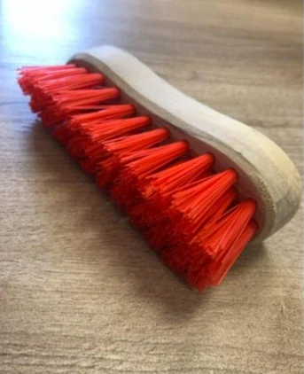 Malý kartáček na čištění koňských kopyt. Dřevěná rukojeť o délce 12cm a štětinky dlouhé cca 2 cm v červené barvě. Na jednom konci je tvar kartáčku do špičky, druhá konec je zaoblený.