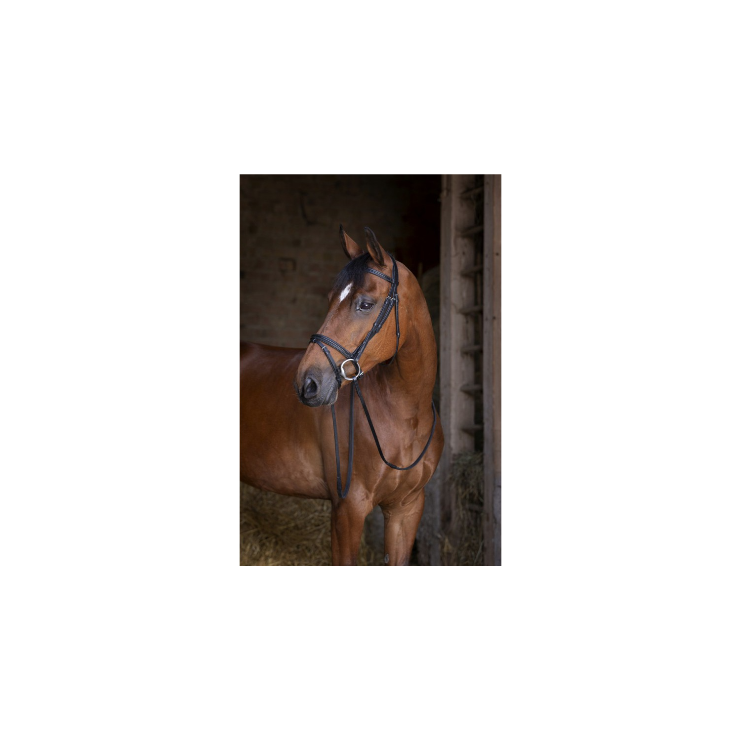 Kožená uzdečka Erick Thomas Shiny s anglickým kombinovaným nánosníkem je vyrobena z měkké kůže. Nátylník, čelenka a nánosník mjsou doplněny o měkké vypodložení. Čelenka s nánosníkem jsou doplněny o jemný, lesklý proužek černé barvy. Zapínání otěží a lícnic je na háčky, které jsou směrem dovnitř. Uzdečka je v sadě s gumovými otěžemi.