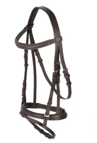 Klasická anglická uzdečka s kombinovaným nánosníkem, měkce podloženou čelenkou, nátylníkem a nánosníkem, dodávána včetně plátěných otěží se zarážkami.