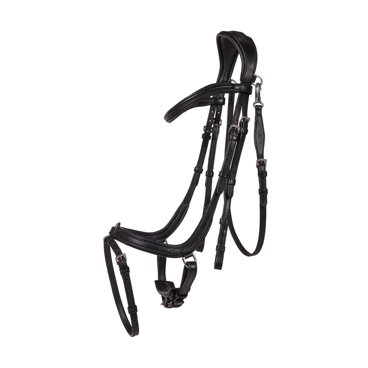 Anatomicky tvarovaná uzdečka z měkké kůže, podložená v oblasti nátylníku, nánosníku a čelenky. Nátylník je rozšířený pro lepší rozložení tlaku.