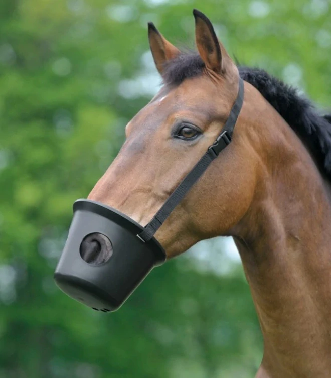 Robustní, omyvatelný plastový náhubek s plynule nastavitelným nylonovým páskem na hlavu. S průduchy pro neomezené dýchání. Barva: černá Ø: 20 cm