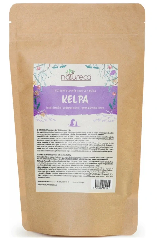 Kelpa je hnědá mořská řasa (chaluha) s vysokým obsahem minerálních látek a jódu. Silná podpora přirozené imunity, antioxidant, podpora trávení a pigmentace kůže i srsti, odstraňuje zubní kámen a pach z tlamy. Je to jedinečný zdroj jódu.
