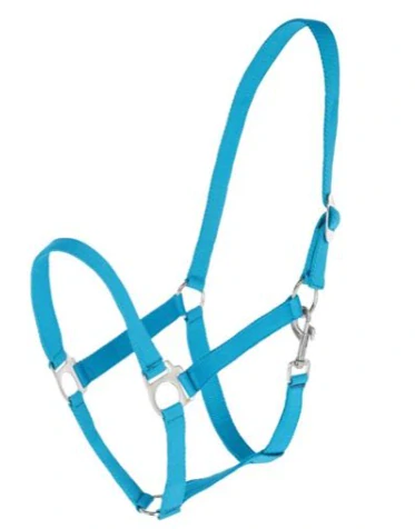 Nylonová ohlávka Covalliero v tyrkysové barvě. Nastavitelná délka nátylníku pomocí spony. Zapínání na otočnou karabinu. Nerezové přezky.  celý popis