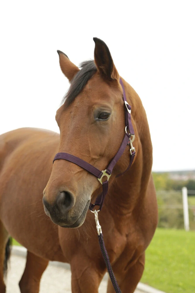 Klasická nylonová ohlávka s nerezovým kováním, možností nastavení za ušima, zapínáním na karabinu.