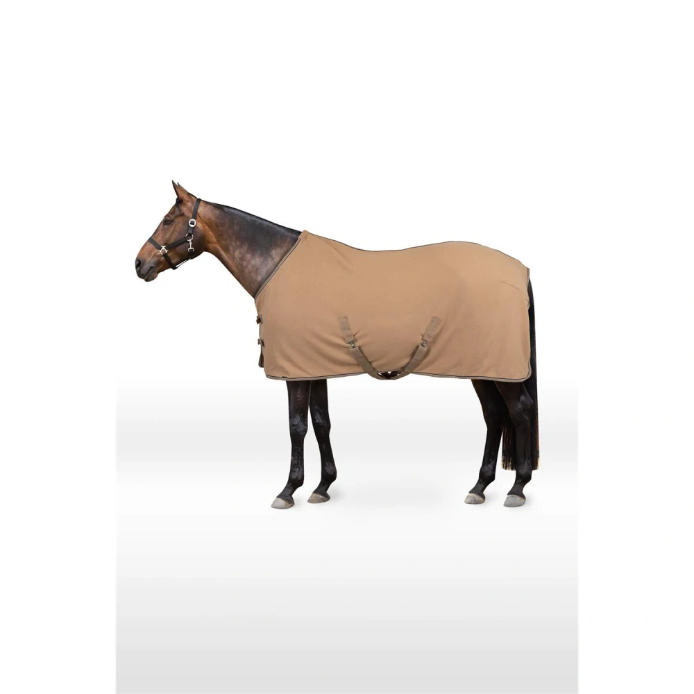 Odpocovací deka značky Horze v béžové barvě s křížovým zapínáním pod břichem.