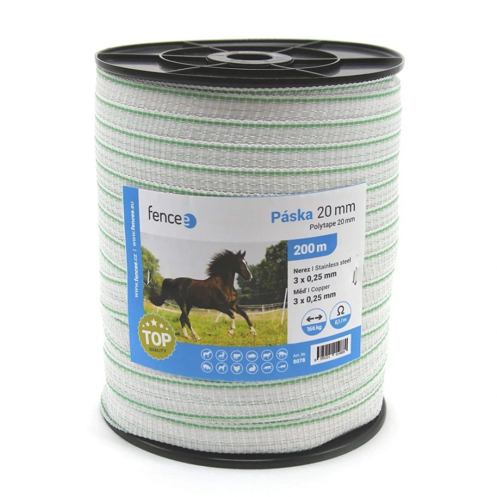 - Páska pro elektrický ohradník, šířka 20 mm, zeleno-bílá, délka 200 m, odpor 0,10 Ω/m