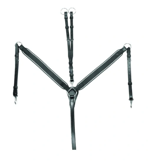 Poprsník vyrobený z odolné kůže. S elastickou vsadkou na krční části. Odnímatelné martingalové vidlice