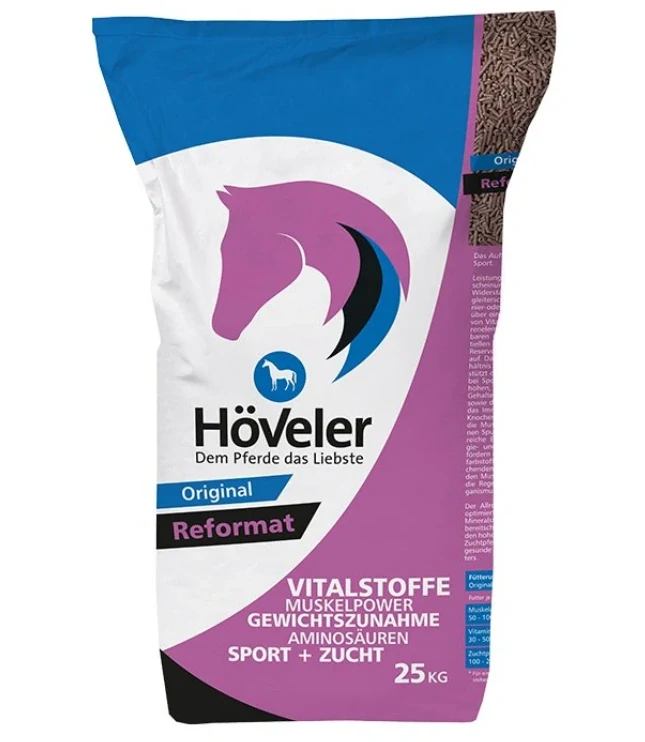 Höveler Reformat je všestranné doplňkové krmivo s vysokým obsahem aminokyselin, které optimalizuje výkon jak sportovních, tak chovných koní a v neposlední řadě podporuje zdravý růst mladých koní. Únava či ztráta výkonu často provázejí zvýšenou zátěž v závodní sezóně, během náročných tréninků nebo v připouštěcí sezóně. Toto unikátní krmivo obsahuje propracovanou kombinaci vitamínů, minerálů a stopových prvků, ale i snadno dostupné sacharidy (uhlohydráty) pro rychlé a cílené doplnění vyčerpaných zásob. Optimální poměr aminokyselin ze sóji a pivovarských kvasnic podporuje cílené budování svalů u sportovních a chovných koní.