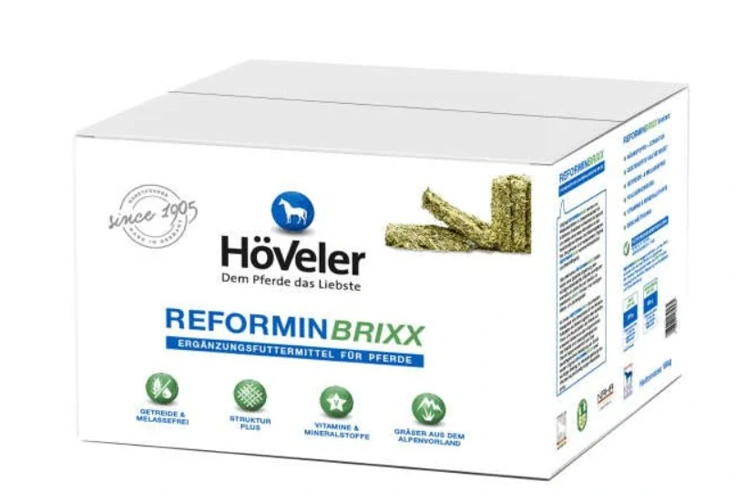 Reformin BRIXX představuje unikátní kombinaci krmného doplňku a vlákniny v jednom. Doplňuje tak naši osvědčenou řadu Reformin o nové, chutné minerální krmivo bez obilovin a melasy. BRIXX je víc než jen klasické krmivo pro koně – je to promyšlené řešení pro moderní majitele koní. Díky speciální receptuře podporuje přirozené stravovací návyky koně a zároveň zajišťuje vyvážený přísun živin se všemi důležitými minerály, vitamíny a stopovými prvky.