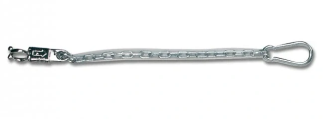 Řetěz potažený čirým PVC, s pružinovým hákem a panikovým hákem.