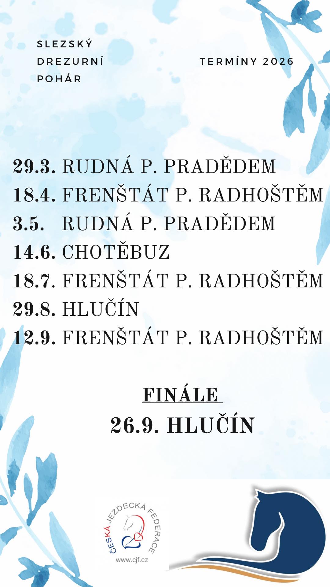 I v letošním roce se podílíme na sponzoringu Slezského drezurního poháru (ročník 2026), kdy Vás srdečně zveme na kvalifikace Rudná pod Pradědem (29.03.), Frenštát pod Radhoštěm (18.04.), Rudná pod Pradědem (03.05.), Chotěbuz (14.06), Frenštát pod Radhoštěm (18.07.), Hlučín (29.08.), Frenštát pod Radhoštěm (12.09.) a finále v Hlučíně (26.09.).