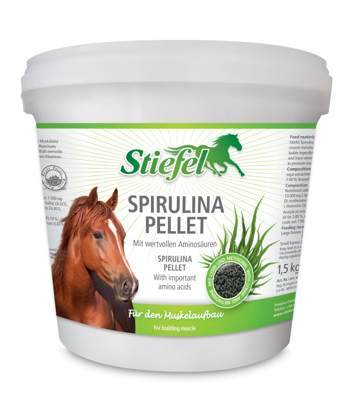 Doplňkové krmivo pro koně Stiefel Spirulina pelety může pomoci při nasvalení a podpoře svalového metabolismu. Tato vyjímečná čistě přírodní řasa obsahuje cenné organicky vázané vitamíny a stopové prvky a také esenciální aminokyseliny, které mohou podporovat růst a zdravý vývoj svalů.