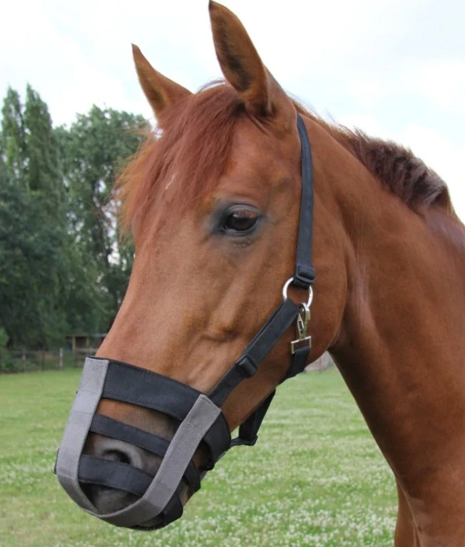 Náhubek odolný proti roztržení, bez pryžových vložek. Podšitá v oblasti tlamy a měkce polstrovaná. Bezproblémově nastavitelná nylonová hlavice s dotykovou páskou na hlavici jako bezpečnostní opatření. Aby se zabránilo nadměrné konzumaci trávy nebo v případě onemocnění.