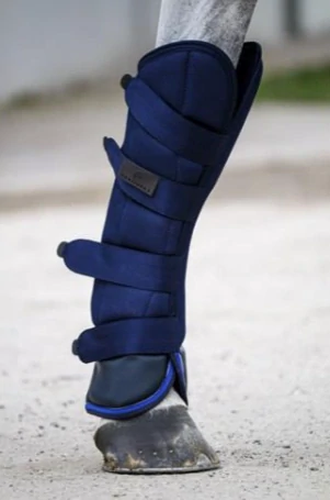 Transportní chrániče Equithéme v tmavě modré barvě vhodné na přepravu koní.