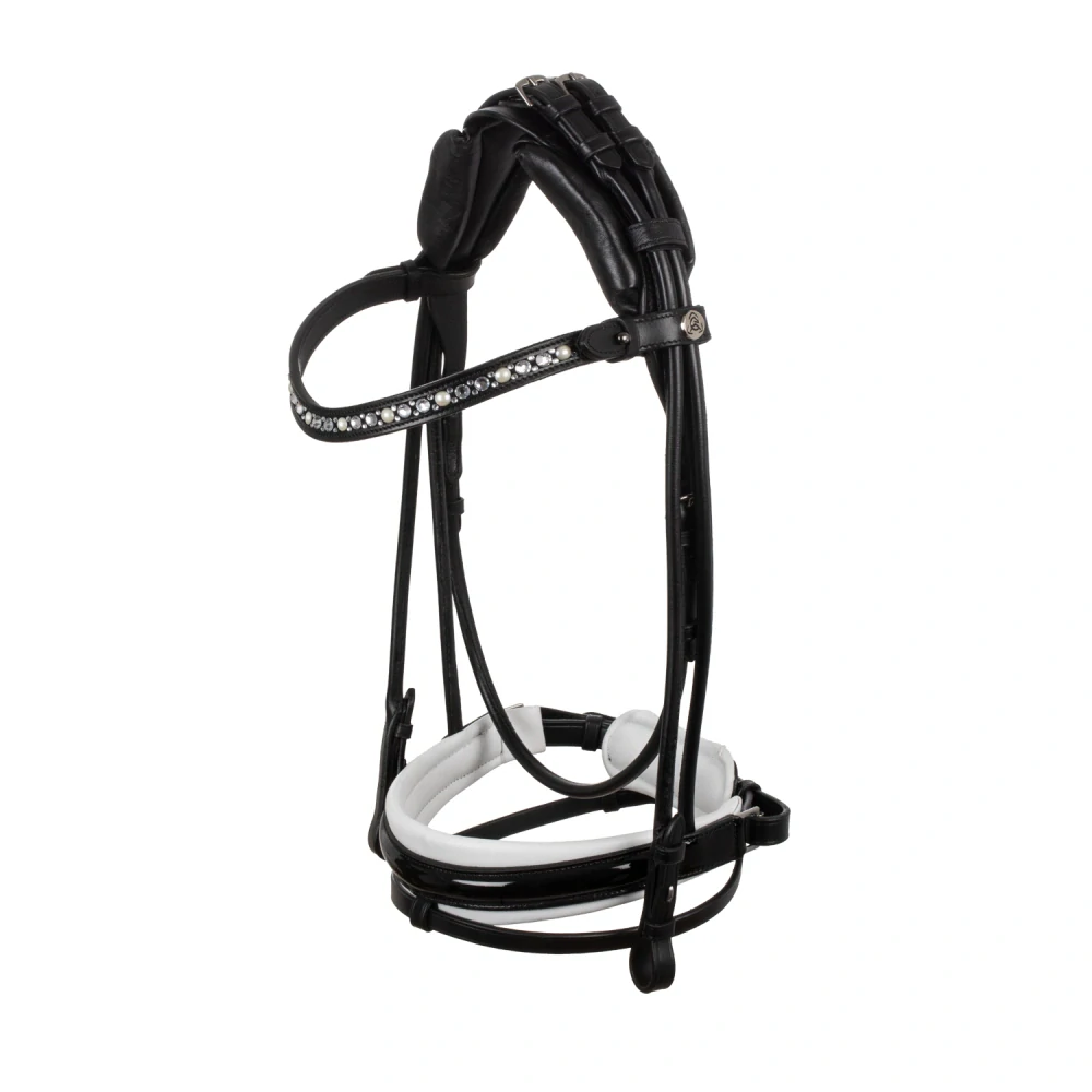 Mistrovsky zpracovaný kulatý tvar představuje kombinaci elegance, pohodlí a výkonu. Anatomický nátylník je polstrován latexem. Je nastavitelný a navržený tak, aby střední část zůstala volná, čímž se snižuje tlak na lebeční oblast koně, aniž by se zasahovalo do citlivé oblasti uší. Polstrovaný nánosník s bílým lemováním dodává uzdečce rafinovaný a sofistikovaný design. Elegantní čelenka je zdobena bílými kamínky, které jí dodávají nádech luxusu a sofistikovanosti. Nastavení je umístěno na nátylníku, což zajišťuje čistý a elegantní vzhled. Robustní přezky z nerezové oceli zaručují dlouhou životnost a bezpečné zapínání. Tyto přezky jsou nastavitelné, abyste uzdečku přizpůsobili potřebám svého koně.