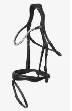 Měkce vypodložená kožená uzdečka Horze v černé barvě. Čelenka s jednoduchým odepínáním na cvočky je zdobena kamínky, které dodávají uzdečce elegantní vzhled. Součástí uzdečky nejsou otěže.