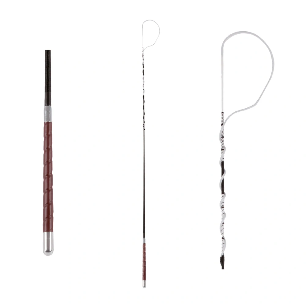 - Černo-bílý bič s hnědou koženou rukojetí.