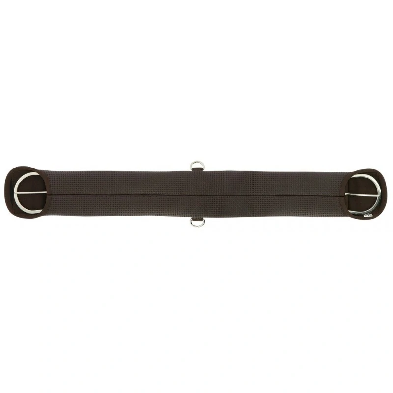 Měkký, pohodlný a snadno omyvatelný westernový podbřišník značky Equitheme. Podbřišník je vhodný obzvláště pro citlivé koně. Uprostřed po stranách jsou dva kovové kroužky pro pomocné otěže. Ploché přezky jsou poniklované o rozměru 75 mm po obou stranách. Vnitřní vrstva je zesílená.